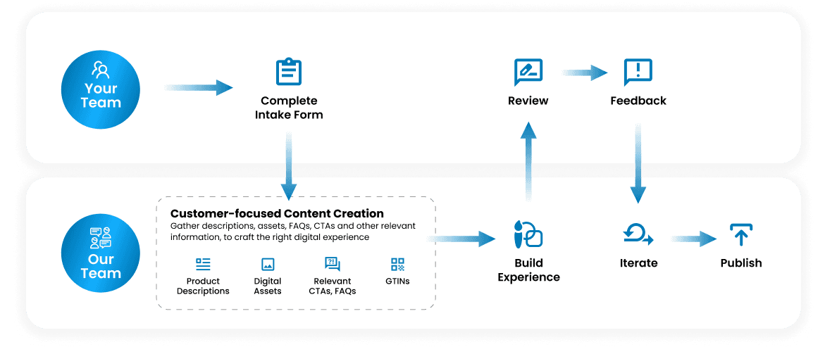 That's why we handle it. From GTIN registration and resolver setup through content enrichment and compliance verification, our team manages the process end to end — so your team isn't the bottleneck.